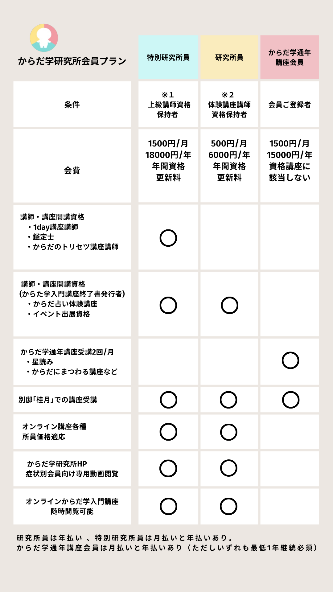 「からだ学的からだの取扱説明書読み解き講座講師」の方にご登録いただけます。からだ学特別研究所員にご登録方法は該当者に事務局からご案内いたします。